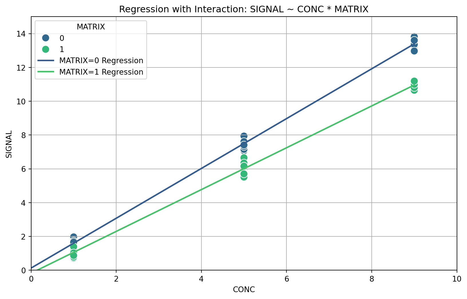 Statistically, to detect a matrix effect, we should perform a linear regression and test the significance of both the interaction term (β₃) and the intercept shift (β₂). This comprehensive approach ensures we fully evaluate the potential impact of the matrix on both the slope and intercept of the calibration curve.